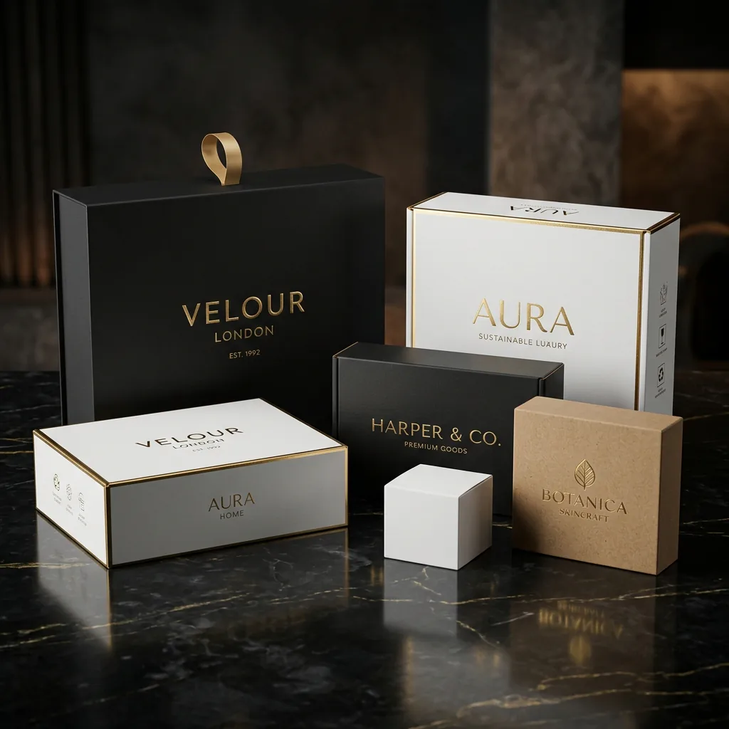Logo-printed custom boxes across multiple styles, sizes, and finishes for consistent brand identity.